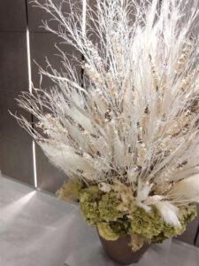 当初のご要望ではメインの枝物が桜でしたが、お客様とご相談し、季節感は出さない方向で進めることにいたしました。そこで、桜の代わりに白い枝と淡いピンクベージュのデルフィニウムをご提案。白い枝は、フェイクフラワーと三又などのドライフラワーを混ぜ合わせ、単調にならないように工夫しました。また、アジサイやパンパスグラス、スモークツリーなどの植物を合わせてオブジェ風に。プリマらしい上品さとお客様のイメージとのバランスを取りながら製作いたしました。