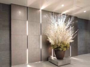 実際に設置すると、アレンジメントの背後から効果的に照明が入り、エントランスのラグジュアリーな空間とマッチした仕上がりになりました。お住まいになる皆様にとっても心地よいリッチな空間になりますように。