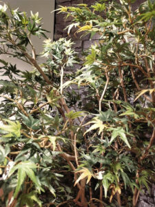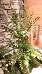 モミジや、ツバキ、ケヤキなどの樹種の幹部分は、本物の生木を使用した日本製の特注品です。約3mある天井高に合わせ、2mを超える特注大型植物をご提案。新緑の葉が生い茂る樹種を中心に120cmから2m超の植物を揃え、高低差をつけてリズミカルに配置いたしました。