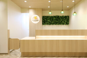 カウンター周りはすっきりとした印象を保ちつつ、グリーンがほどよく視界に入ることで、受付として適切な落ち着きと親しみやすさを備えた環境に仕上がりました。