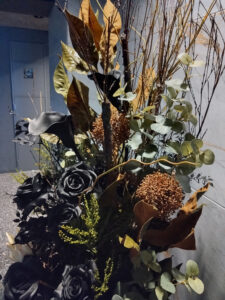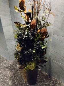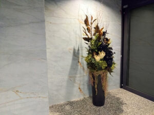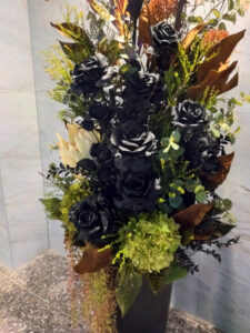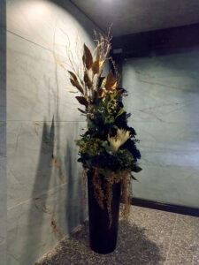 高さ180cm以上の大型アレンジメントは、エントランスのスケール感にぴったり収まりました。照明を受けた花材には陰影が生まれ、大理石調の背景と響き合いながら空間全体に品格をもたらしています。ブラックを基調としたデザインは過度な重さを感じさせず、シックな空間に洗練されたアクセントをプラス。完成後には「さすがプロの仕事!何も言うことがない」とのお言葉をいただき、エントランス装飾として完成度を高めた仕上がりとなりました。