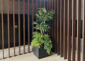 プランターはエントランスのスケールに合わせ、500×500mmの黒色キューブ型を採用しています。プランターに組み合わせるフェイクグリーンは、お客様がご希望されたショウナンゴムの木をメインに、アレカヤシや大ぶりのサッカレンテンを合わせました。さらにシダ類やアイビーを垂れ下げることで、奥行きと動きを演出。量感と陰影を意識したスタイリッシュな印象に仕上げています。