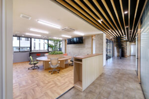 さらに、天井近くまで高さのあるグリーンを配置することで、空間に高低差が生まれ、広がりを感じる効果も。仕事やコミュニケーションがより快適に進む、バランスの取れたオフィス空間を演出します。