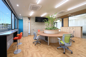 丸いテーブルの形状は、自然と人が集まりやすく、限られたスペースでも一人ひとりが程よい距離を保てる効率的なレイアウト。フェイクグリーンと組み合わせることで、機能性とデザイン性を両立した「人が集うオフィス空間」を実現しています。